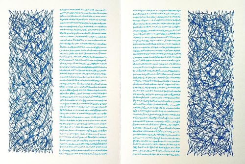 11. O graphê – gostaria de enfatizar – como dança manuscrita: é isso que essas arquiteturas nos apresentam. A palavra grega γραφή já trazia em si essa ambiguidade: é escrever, sim, mas também desenhar, inscrever, cortar, dançar. E em um nível mais profundo, é também a marca de um corpo que se move. O que a imagem nos devolve é esse rastro: um corpo de escrita, o de um quirógrafo baiano-carioca, que não diz, mas coreografa sua presença por meio de gestos repetidos. As linhas azuis em ambas as margens são traços que se aproximam do ilegível, mas não do ininteligível. Parecem representar o plasma, a ficção, de uma energia em movimento, a visualização de um ritmo que insiste, varia, vibra. Não são formas figurativas, mas também não são aleatórias: são formas de insistência, de desejo inscrito. O termo grego πλάσμα — ficção, mas também molde — nos permite pensar que cada traço é uma forma de modelar o tempo. A criança que escreve linhas, como o dançarino que repete um passo, ou o músico que toca em loop, está incorporando um desejo de forma, um ensaio de configuração. A ficção nesse caso não é narrativa, mas ritual e material: não se trata de contar algo, mas de configurar o espaço como uma experiência sensível. Esse duplo ato de escrever e desenhar pode ser lido como uma ficção verbal transposta para o visual: o gesto caligráfico se repete como um loop, mas não repete a mesma coisa. A menor variação entre uma linha e outra dá origem a uma coreografia gráfica do pensamento, elaborada por uma mão que não repete o que já é conhecido, mas dá origem a formas, tempos, espaços. Em cada traço há uma duração, uma pressão, uma respiração. Ao insistir na escrita manual, o trabalho arquigráfico de Evando Nascimento restaura a presença do corpo no ato de criar, transformando a página em uma superfície de inscrição temporária, onde cada linha não diz o que acontece: é o que acontece.