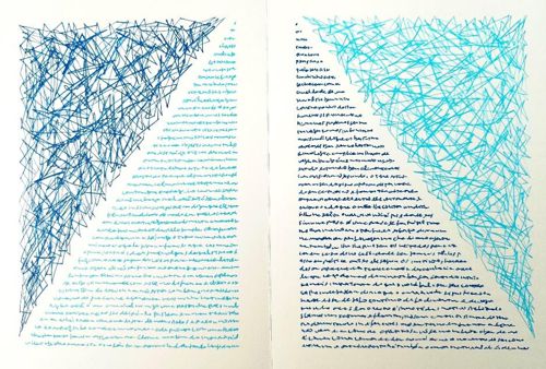 6. Da linha ao plano, do texto à parede, o projeto arquigráfico não apresenta uma única forma de inscrição, mas várias, todas elas geradas à mão, mas regidas por diferentes lógicas espaciais: colunas verticais manuscritas que evocam tanto o formato dos projetos arquitetônicos quanto o de uma escrita de arquivo. Ali, a letra se acumula linha por linha até formar blocos de texto que funcionam mais como paredes escritas do que como textos legíveis. São pilares da escrita, formas arquitetônicas formadas por letras que formam colunas. Faixas de gráficos que se cruzam, que operam como campos visuais autônomos. À primeira vista, parecem rabiscos ou listras, mas são construídos através da reiteração de um gesto, de uma trajetória da mão que se repete até que a densidade seja produzida. Não há letras reconhecíveis, mas há ritmos, direções, corpos do traço. Essas listras funcionam como elementos estruturais que flanqueiam o espaço da escrita legível. São paredes, tecidos ou treliças de tinta. Encontramos páginas de texto horizontal multicolorido, nas quais diferentes tintas (azul marinho, azul turquesa, cinza) se alternam linha por linha. O texto parece escrito para ser lido, mas a caligrafia é quase irreconhecível. Essa indecisão entre ler e assistir torna ambígua a função do texto: é uma mensagem, uma textura, uma malha? A escrita aqui flutua entre signo e superfície, entre significado e abstração. E é nas áreas de linhas sobrepostas que a letra desaparece, como se a escrita desmoronasse sobre si mesma e se tornasse pura forma. Aqui o traço não aponta mais para a palavra, mas para o ato repetido de marcar, de cruzar o espaço com tinta e pressão. É uma escrita que, como já indiquei, ensaia mais do que declara.
