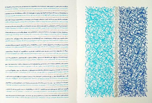 3. E se a superfície da inscrição é relevante, a tinta como matéria viva também adquire um papel decisivo. A tinta não é neutra. Não é transparente em relação ao significado. É uma substância que mancha, brilha, escorre, engrossa ou se esgota. No Livro de Artista intitulado Interseções, que faz parte do projeto das Arquigrafias, a escolha do azul marinho, do azul turquesa e do cinza não se refere apenas a decisões estéticas, mas também a uma paleta material e simbólica: azul marinho, a cor do projeto arquitextônico; turquesa, vibração entre a água e o céu; cinza, sombra ou contorno. Cada cor define um regime de visibilidade, uma modulação do ritmo, uma temperatura do traço. E como cada gesto é feito à mão, a quantidade de tinta, a pressão, a velocidade, o retardo, tudo isso afeta o traço final. Não há automação. A tinta reage à mão: às vezes escorre, às vezes se retém. Assim, uma escrita é produzida como matéria viva, uma escrita que pulsa.